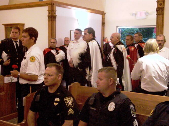 The ceremony was organized by the Holy Child Knights of Columbus and supported by local Fire Departments and Emergency Medical Teams, local and State Police, the U.S. Military, American Legion, VFW, the Boy Scouts of America and the Fourth Degree Color Corps from the Fr. Denys Baron Assembly.