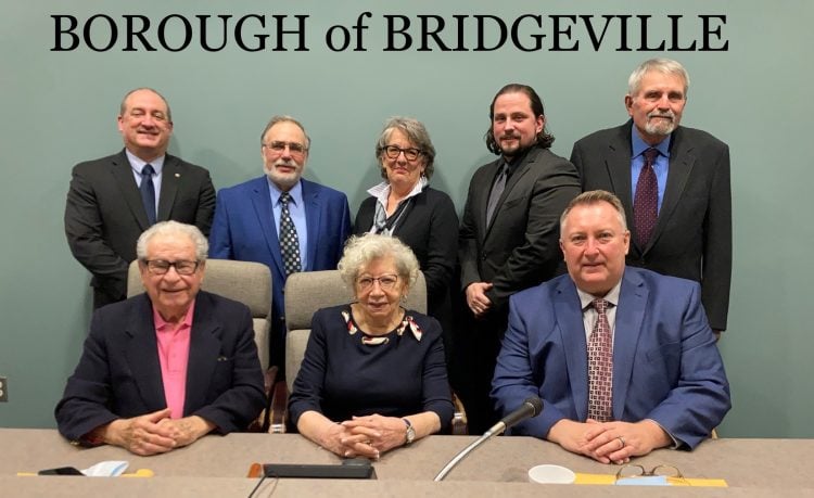 BRIDGEVILLE BOROUGH COUNCIL AND MAYOR: (l-r top row) Joseph Verduci, Bruce Ghelarducci, Justine Cimarolli, Nick Ciesielski, Joseph Colosimo (l-r seated) Nino Petrocelli, Mayor Betty Copeland, William Henderson.